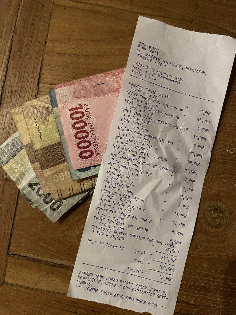Nach einem ausgiebigen Frühstück mit frischen Früchten und frisch gepressten Säften, gingen wir heute Morgen den 1,4 km langen Weg zu einem kleinen Einkaufsladen entlang.In Bali ist man schnell Millionär, sodass wir für 237.000 Indonesische Rupiah eingekauft haben. Das sind umgerechnet ca. 15€. Zu den Preisen eine kleine Auflistung: