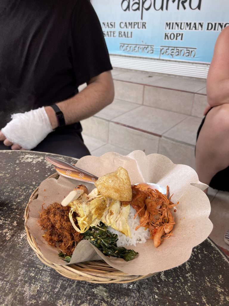 Zur Stärkung haben wir uns diesmal in einem kleinen Lokal gegenüber für „Nasi campur“ entscheiden. Ein leckeres Reisgericht mit allerlei Beilagen. Alles bis auf den Reis kalt serviert. 3 Teller haben uns 75000 Rupien gekostet. Auch wieder sehr lecker und leicht scharf.