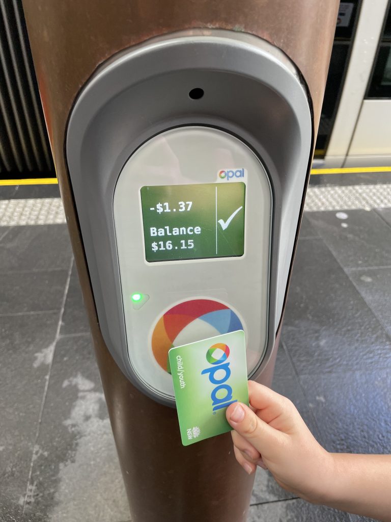 Hier haben wir mal den Checkpoint der öffentlichen Verkehrsmittel aufgenommen. Jedes mal wenn man ein Fahrzeug betritt muss man seine Karte (oder Kreditkarte) dran halten und sich einloggen. Nach dem Verlassen ebenso. Man sieht hier Julius seine OPAL-Kinderkarte. Die meisten Australier die wir sehen, nutzen auch eine OPAL Karte. Sandra und ich nutzen die ApplePay Funktion unseres iPhones. Das funktioniert auch.