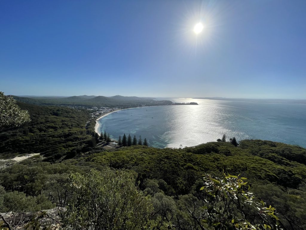 Die kurze Pause war vorbei und ab ging es auf den Tomaree Mountain. Dieser Berg ist 161 Meter hoch und lässt sich zu Fuß erklimmen. Es ist der beste Aussichtspunkt im Ort. Die Aufstieg war bei der Hitze ganz schön hart. Die Einheimischen nehmen den Berg gern als Sportplatz und Joggen dort hoch. Wir haben gute 40 Minuten gebraucht. Es ging über Leitern und Pfade bis zum Gipfel.