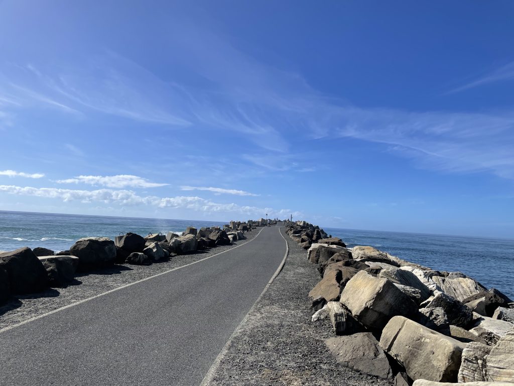 Wir waren heute etwas früher wach und konnten daher auch früher los. Gegen 09:00 Uhr war Abfahrt. Weil es gestern zu spät war, haben wir uns zunächst noch den Lighthouse Beach direkt in Ballina angeschaut. Auch hier war eine Steg aus Steinen direkt ins Meer gelegt um zu einem Aussichtspunkt zu gelangen.