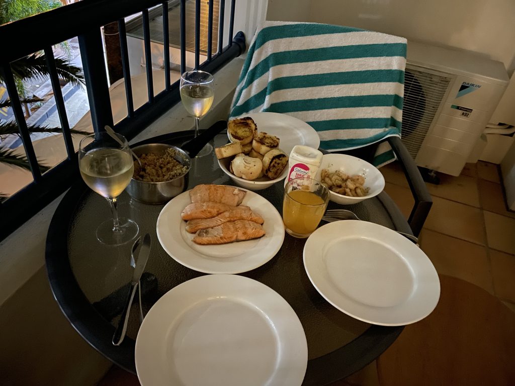 Es gab Couscous mit frischem Lachs, Knoblauchbrot, gebratene Shrimps und leckerer Knoblauchsoße. Dazu ein Prosecco.