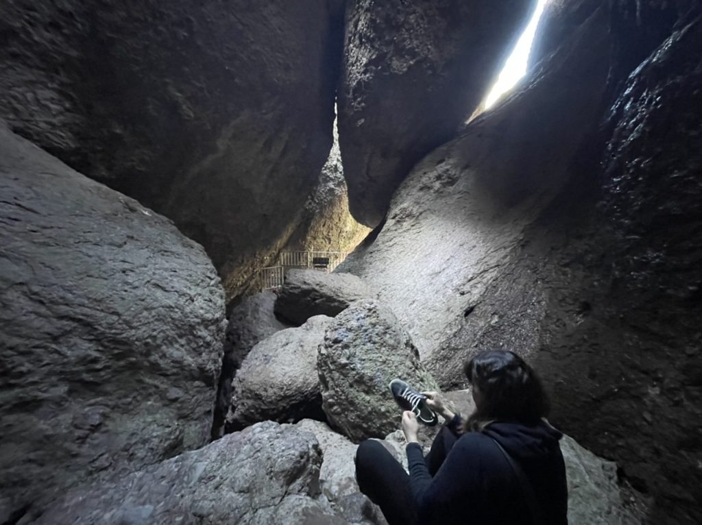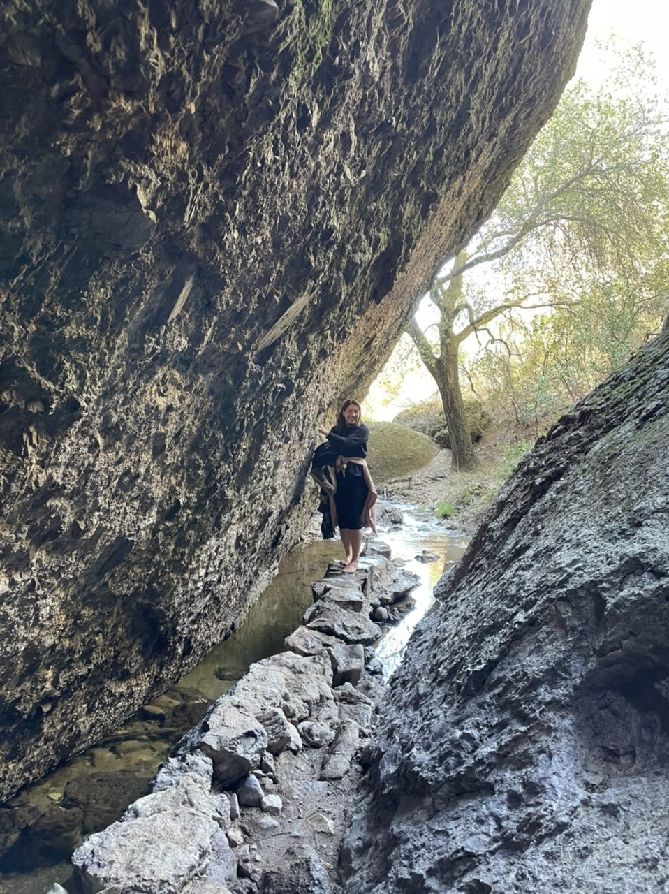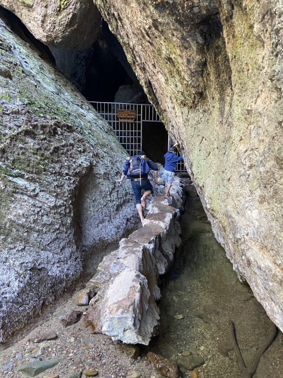 Nach einer kleinen Brücke und einem Spalt durch einen Felsen hatten wir plötzlich nur noch Den kleinen Bach und einen Felsen vor uns. Vom Wanderweg war nichts mehr zu sehen. Wir sind zuerst umgekehrt weil wir dachten wir haben den falschen Weg genommen. Das stimmt aber nicht, wir waren auf dem richtigen Weg. Wir haben ein Wanderer paar gefragt ob es in dieser Richtung zurück zum Parkplatz geht. Sie sagten ja, aber zu dieser Zeit des Jahres nicht ohne nasse Füße zu bekommen. Außerdem sollte man Licht bei haben denn in der Höhle wird es ziemlich dunkel. Wir hatten nun also die Wahl die ganzen 3 km über den Berg zurück zu laufen oder aber 300 m durch den Berg ab zu kürzen. Also haben wir die Schuhe ausgezogen, die Hosen hochgekrempelt und sind los marschiert.