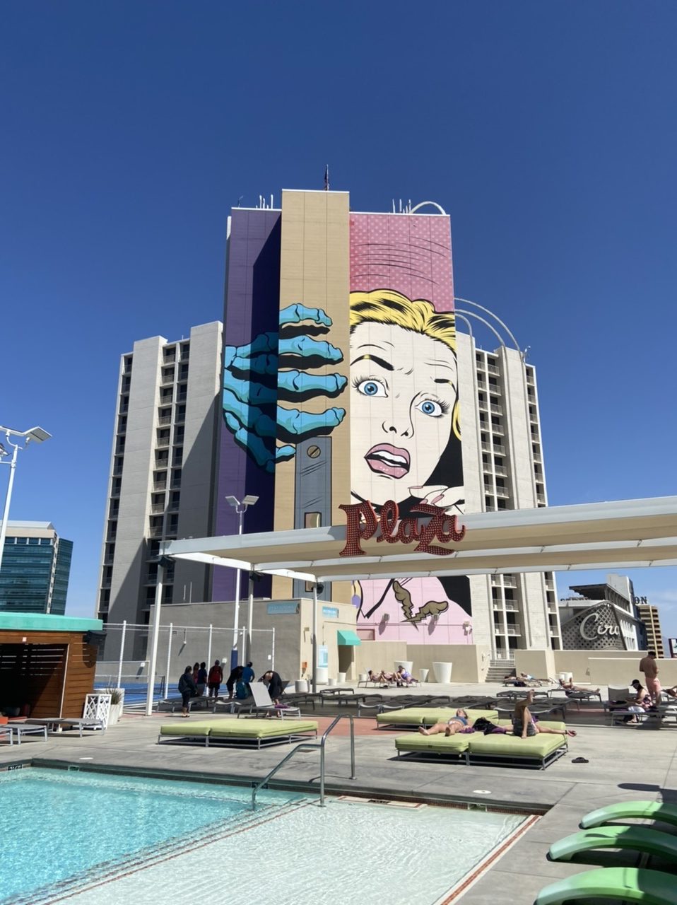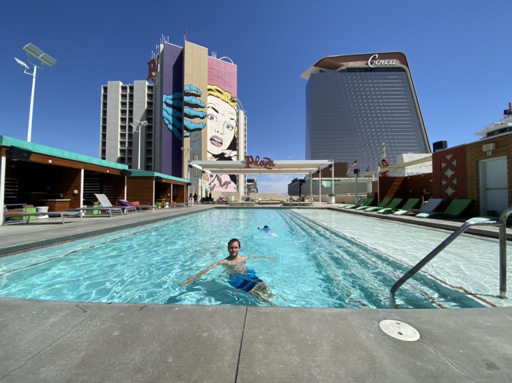 Die erste Nacht In Las Vegas war okay. Trotz gut isolierten Zimmern hat man die Nachbarn morgens um fünf sehr laut heim kommen gehört. Wir haben bis circa 08:15 Uhr geschlafen. Diesmal gab es direkt im Hotel ein McDonald’s und somit waren wir gut mit Kaffee versorgt. Nach ein paar Stullen sind wir dann zunächst im Pool verschwunden. Der Pool lag im fünften Stock im Südtower. Wir mussten dazu wieder quer durch das ganze Casino laufen.