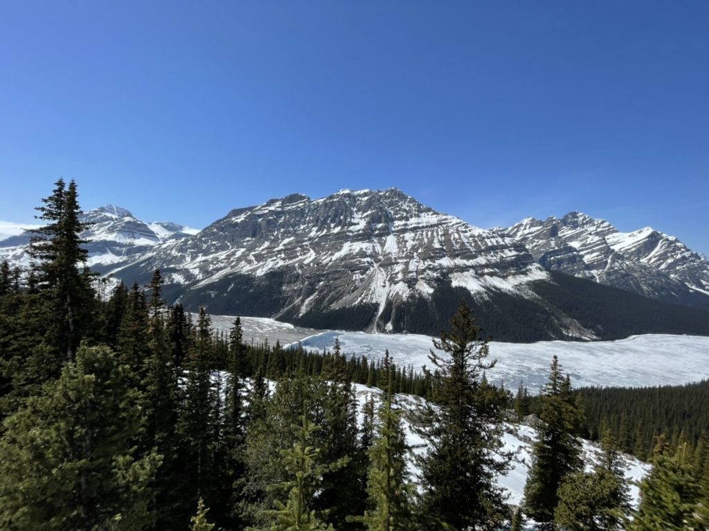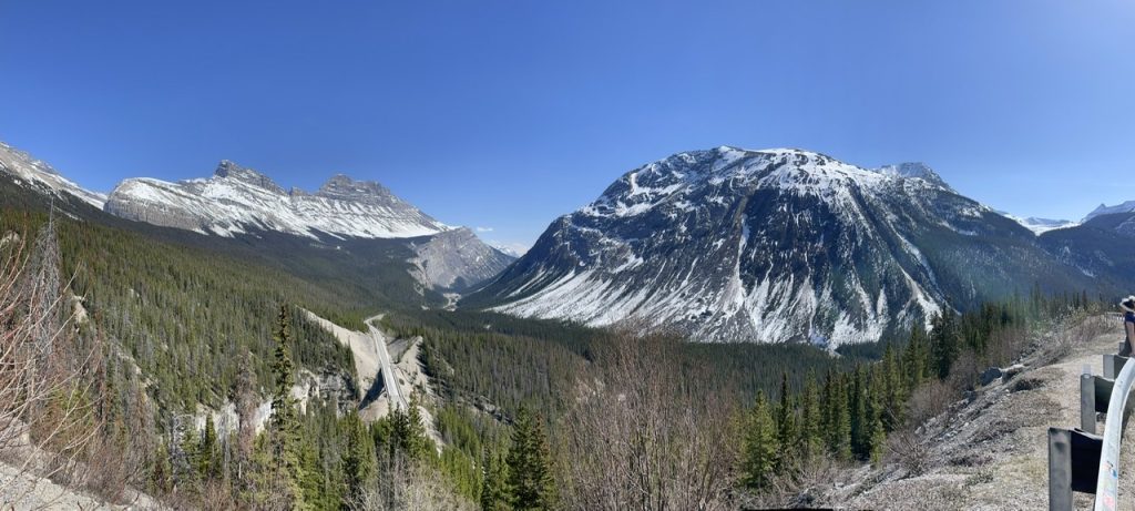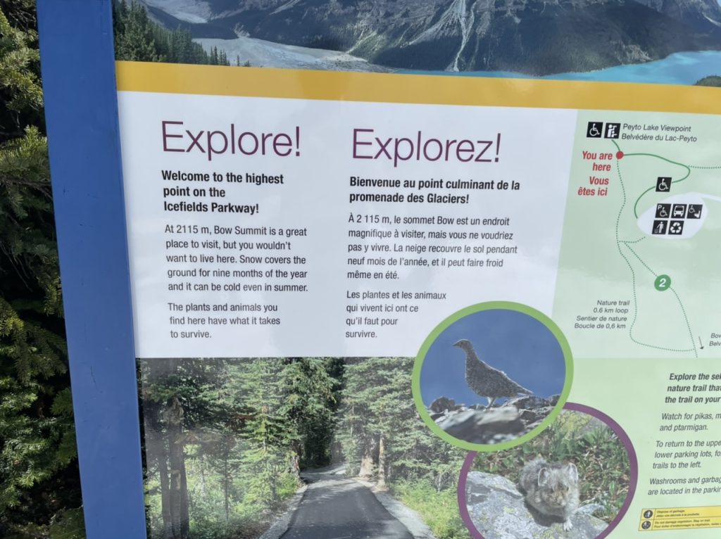 Hier haben wir nur 5 Minuten gehalten und sind dann weiter gefahren. Aber nur 10 Minuten später haben wir schon am nächsten Punkt angehalten. Bow Summit and Peyto Lake.