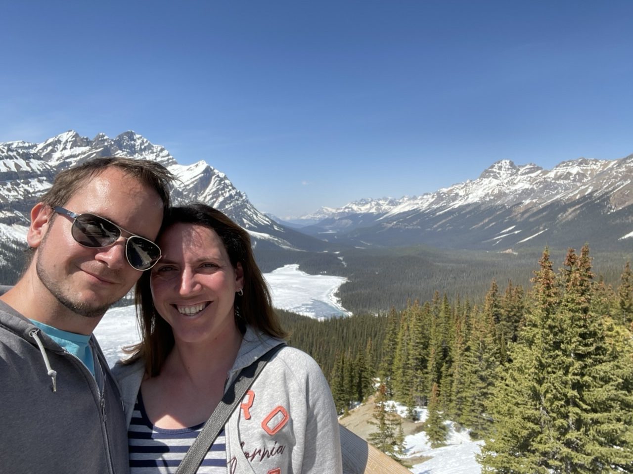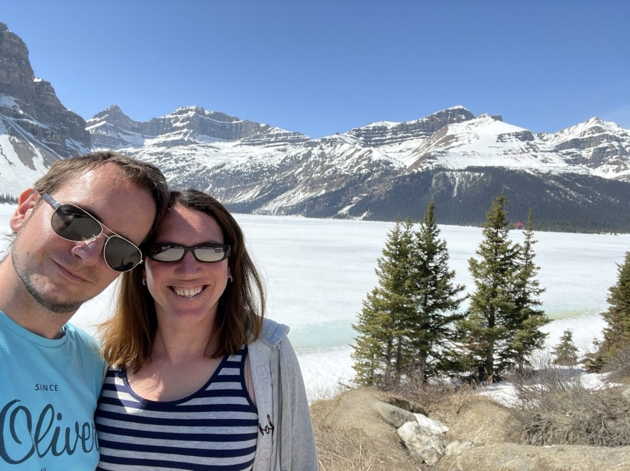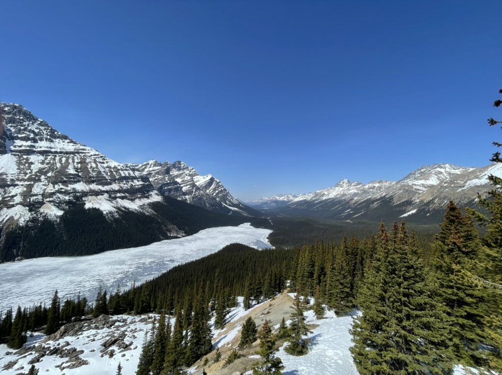 Ein kleiner Teil des Sees war auch schon wieder komplett frei von Eis. Wir wollten dann eigentlich noch beim Moraine Lake Vorbeischauen. Leider war hier der Weg wieder versperrt und wir kamen nicht weiter. Hier geht es erst ab Juni los. Wir haben uns daher entschieden den Weg nach Jasper einzuschlagen. Hier ging es 250 km quer durch zwei Nationalparks. Mal sehen was wir hier noch finden.