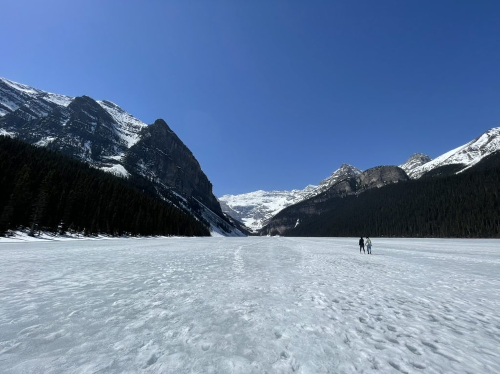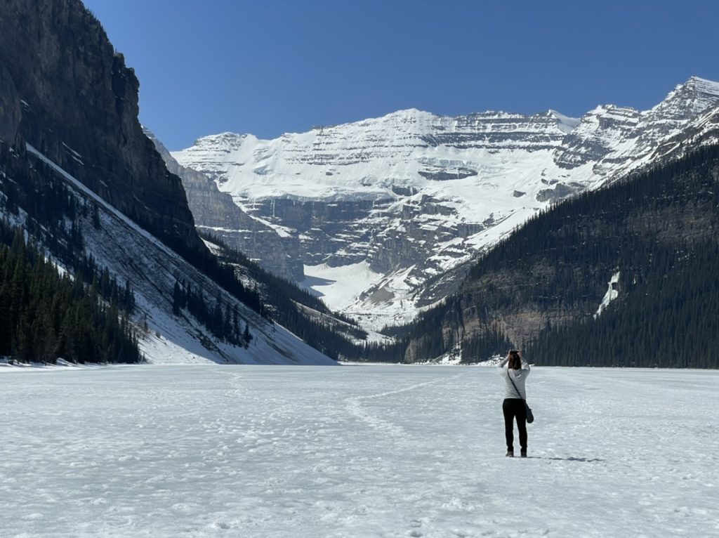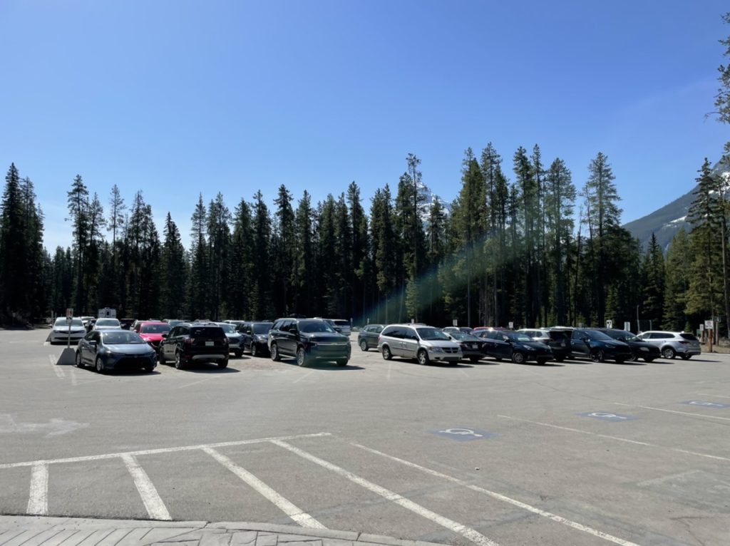 Nach einer kurzen Stärkung ging es weiter zum nächsten Top Spot – Lake Louise. Dieser malerische See liegt in mitten von Bergen und wird als das typische kanadische Panorama verkauft. Nach 25 Minuten Fahrt sind wir an dem sehr vollen Parkplatz angekommen, wir hatten diesmal Glück und haben noch ein Platz bekommen.