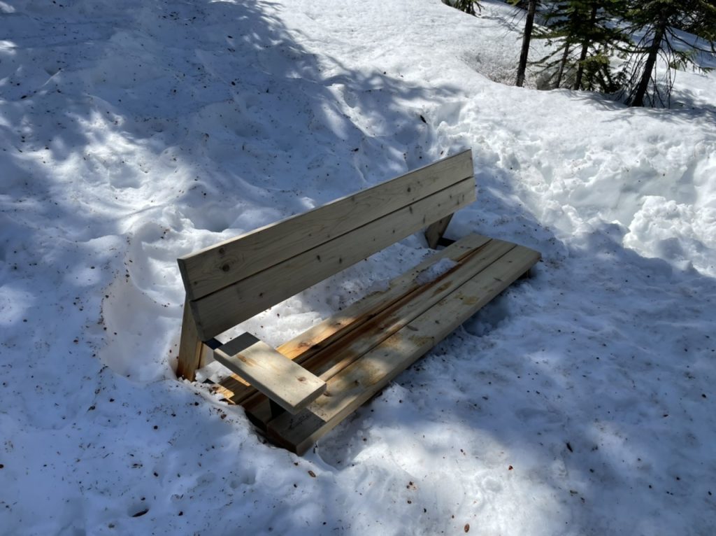 An der Bank kann man sehr gut erkennen wie hoch der Schnee liegt.