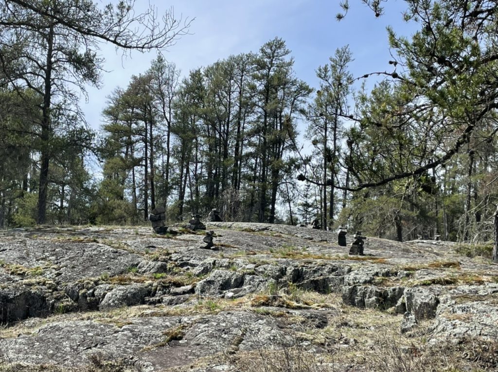 Auf den Felsen haben andere Wanderer Figuren aus dem weggebrochenen Steinen gebaut.