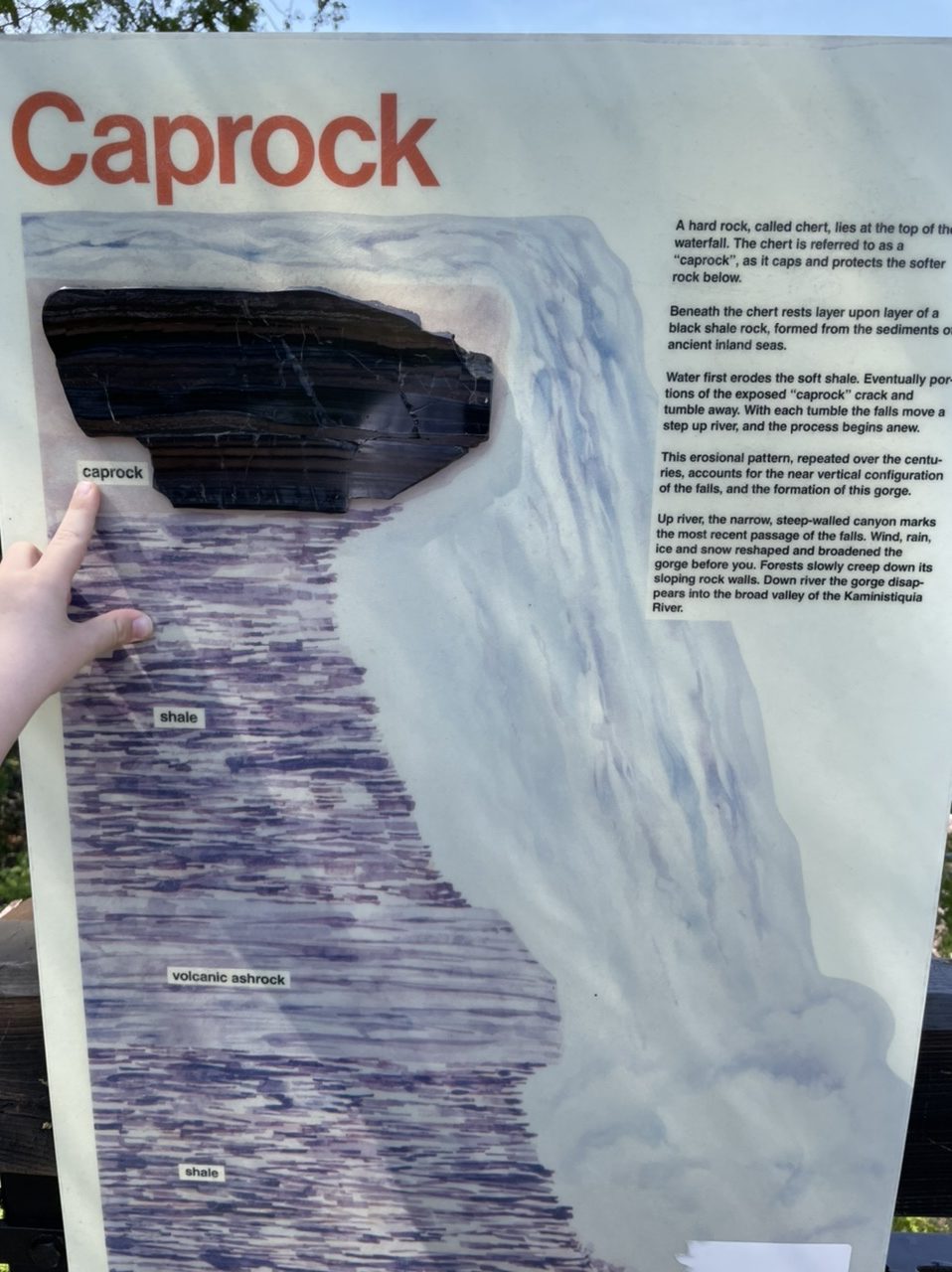 Hier haben wir auch gelernt wie der Wasserfall aufgebaut ist. Die obere Schicht ist ein harter Stein der die unteren Schichten vor dem zu schnellen abtragen schützt. Sobald die unteren Schichten langsam etwas abgetragen sind, bricht der größere Stein auch immer etwas ab. Dann geht das ganze von vorne los