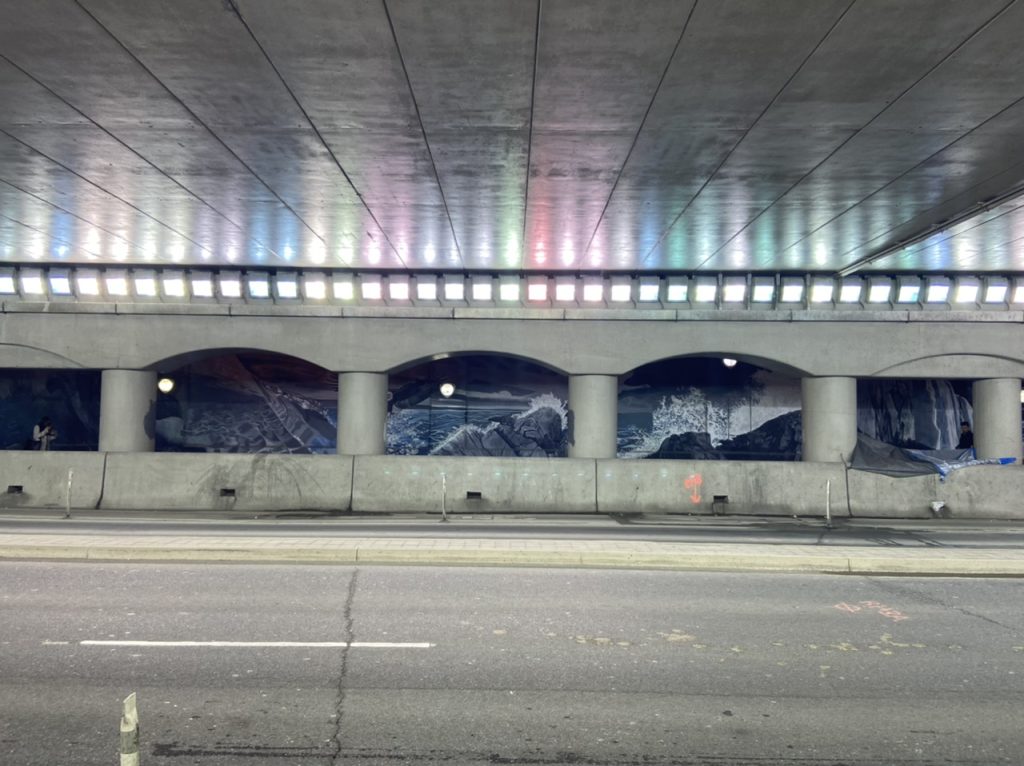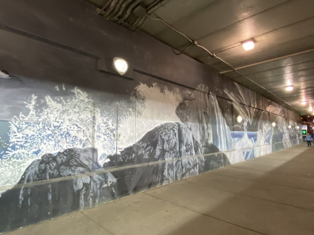 Hinter der Roy Thomson Hall ist der Tower schon gut zu sehen. Um direkt zum Turm zu kommen mussten wir die Bahnschienen überwinden. Dazu haben wir die „Lower Simcoe Street Underpass Murals“ passiert. Ei. Auto und Fußgänger Tunnel mit tollen Malereien.